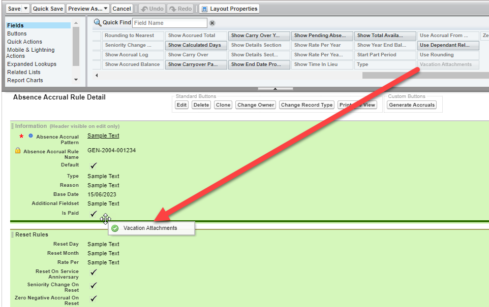 Select the Vacation Attachments field from the panel at the top of the page, and drag it to the Absence Accrual Rule Detail section.