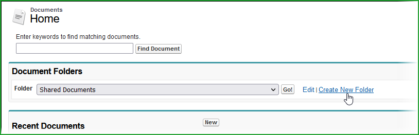 On the Documents Home page go to the Document Folders section and select Create New Folder: