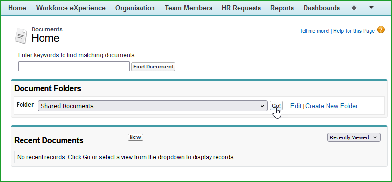 In Salesforce Classic from the Sage People home page select the Documents tab.