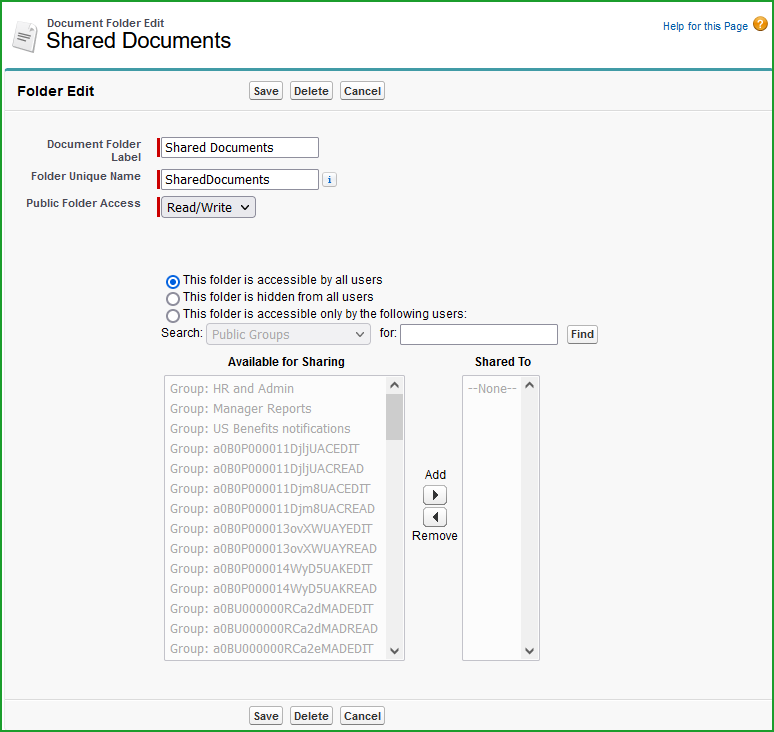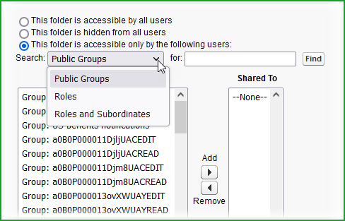 You can then use search to find public groups, roles, or individual users you want to have access to the folder.