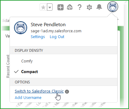 Folder operations are carried out in Salesforce Classic. To switch from Salesforce Lightning Experience to Salesforce Classic: