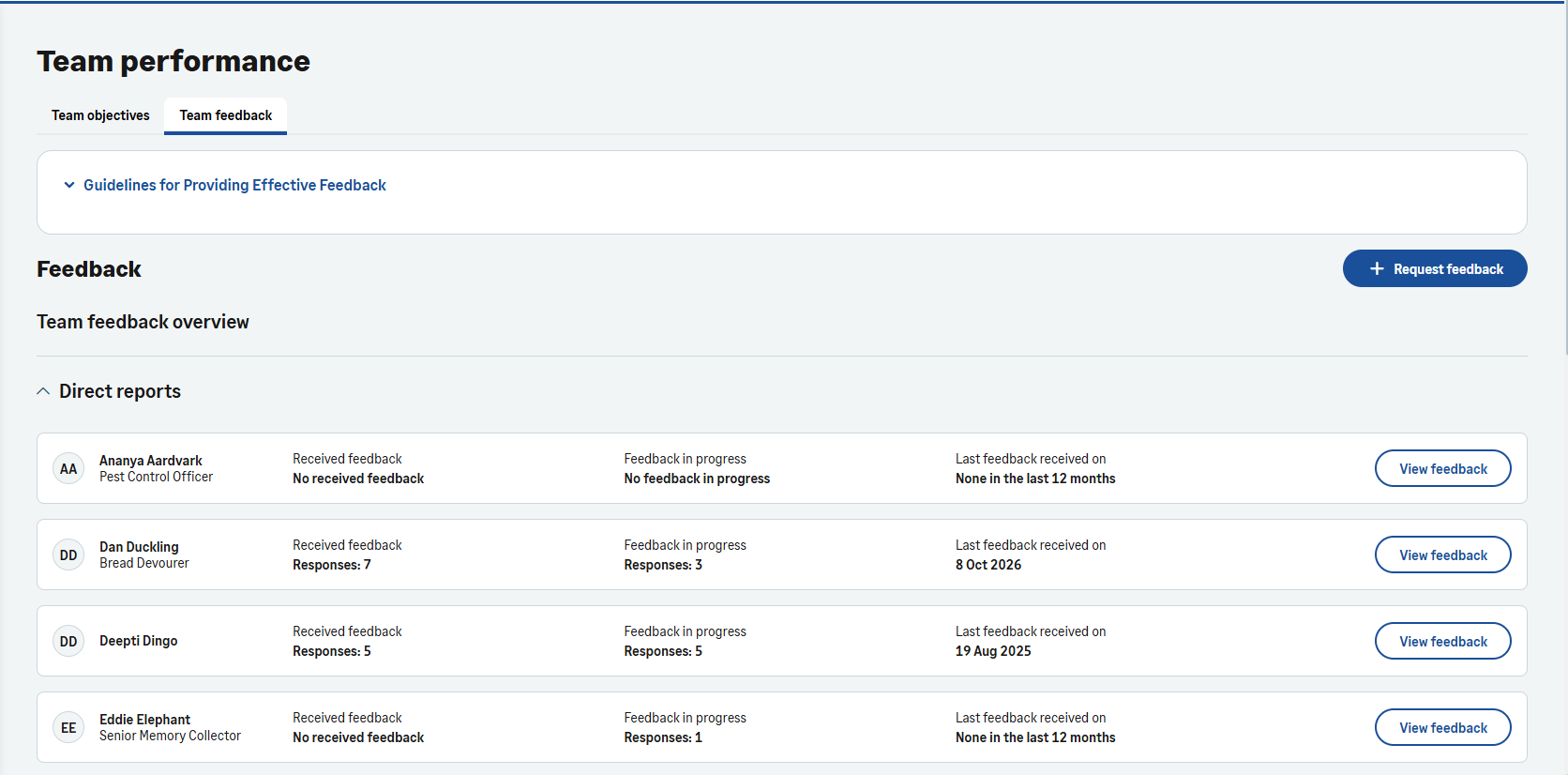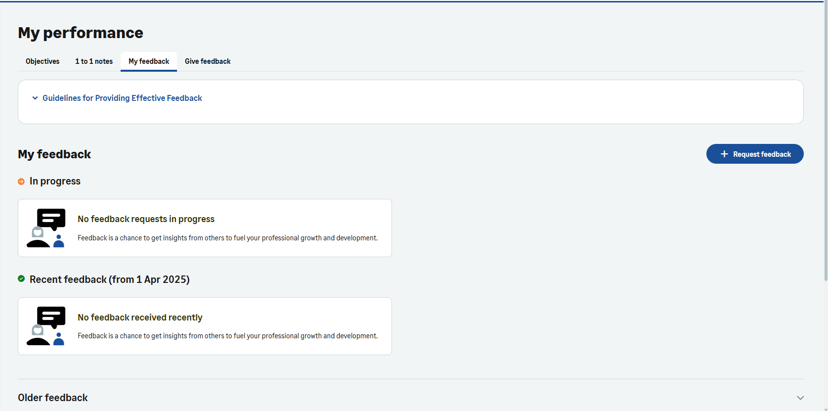 Team members can now view My feedback in the WX sidebar. The tab displays their own feedback requests that are in progress or complete. The system further splits completed feedback requests into current and older than 12 months. For requests in progress, the tab indicates those due complete soon.